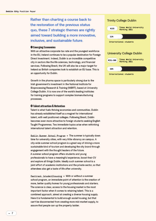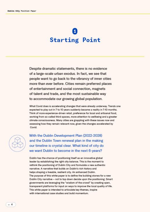 To develop a new positioning for Dublin City in response to the Covid-19 pandemic and the wider behavioural trends that change the form and function of downtown areas. With the Dublin Development Plan (2022-2028) and the Dublin Town renewal plan in the making, the timeline and challenge are crystal clear: what kind of city do we want Dublin to become in the next six years?
