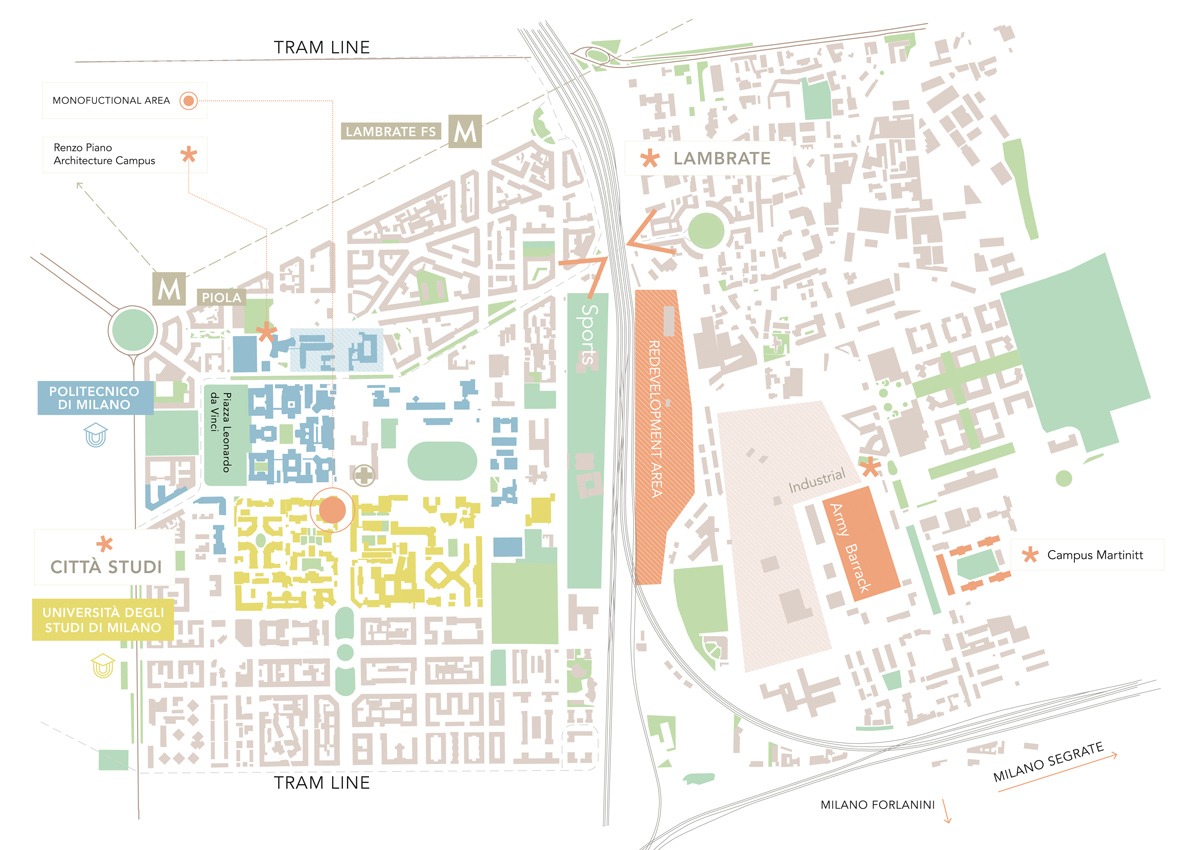 We then brought together a powerful coalition around the concept of the ‘urban campus’. The urban campus places the university at the centre of urban regeneration, leveraging the power of talent as a catalyst for transformation. We challenged the coalition with a few ‘What-if’ questions: What if innovation becomes the norm and learning an essential part of our ‘working’ life? What if future skills in a changing labour market require life-long learning? What if Città Studi would function like the MIT of Italy? What if the Parsons School of Design would open a branch campus in the army barracks of Milan Lambrate? What if we develop ‘negative zoning’ describing what a plot should not become?