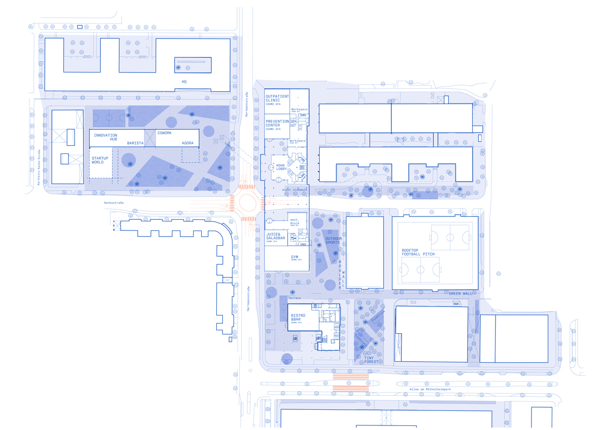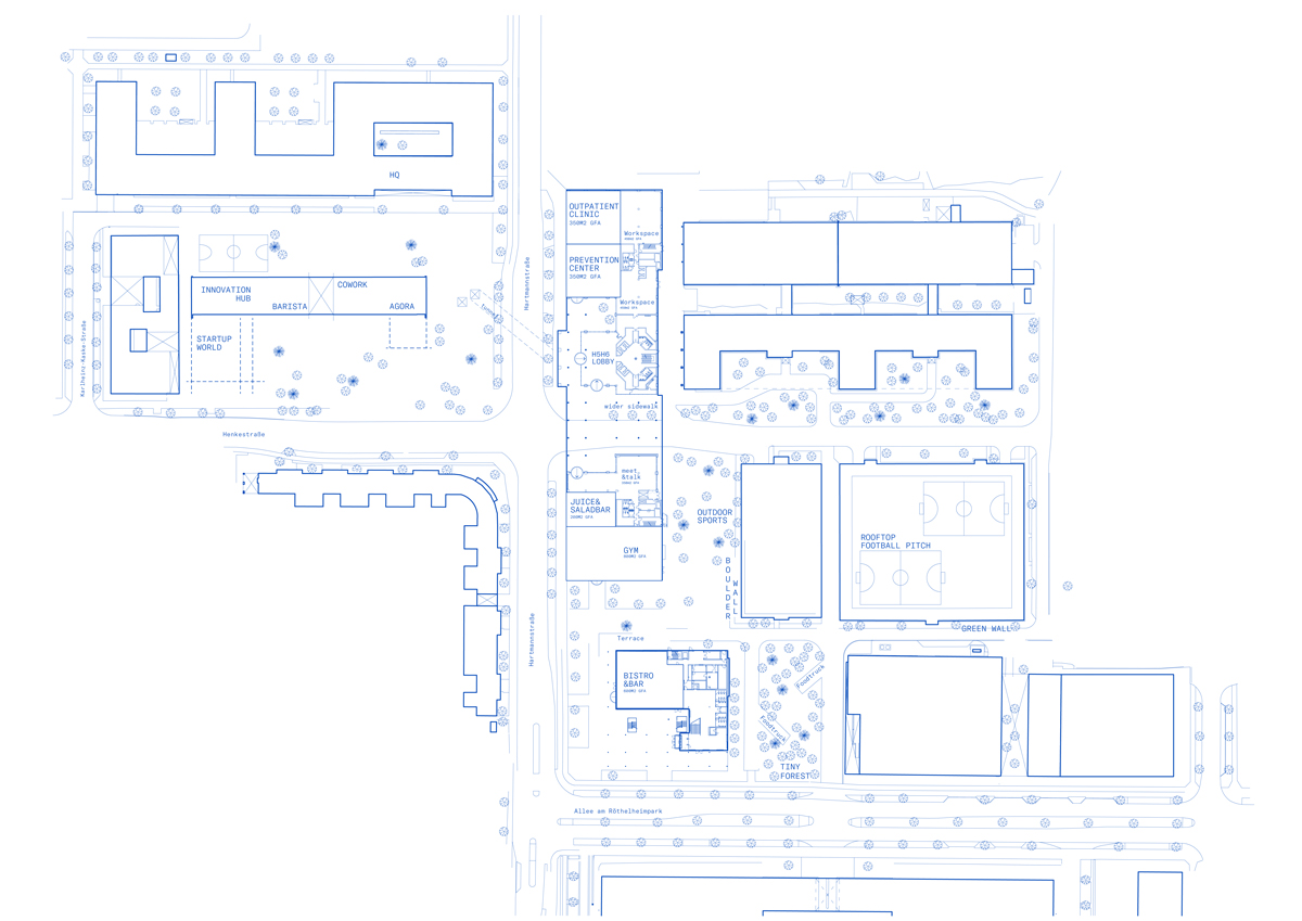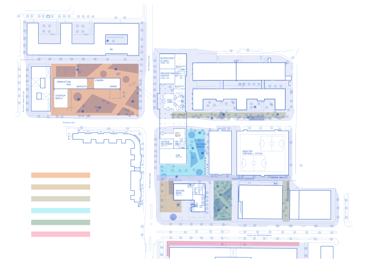 Finally, Blossity translated the public-private innovation typology of Henke127 into a methodology that can be expanded over the entire Siemens Healthcare campus. Here we started from a master plan level, looking at ways to open the ground floor of disconnected, introverted office buildings to create a fluid campus landscape. We developed interventions for several key buildings, translated these into a long-term investment planning, and proposed a set of short-term placemaking initiatives that activate the critical spaces between the buildings.